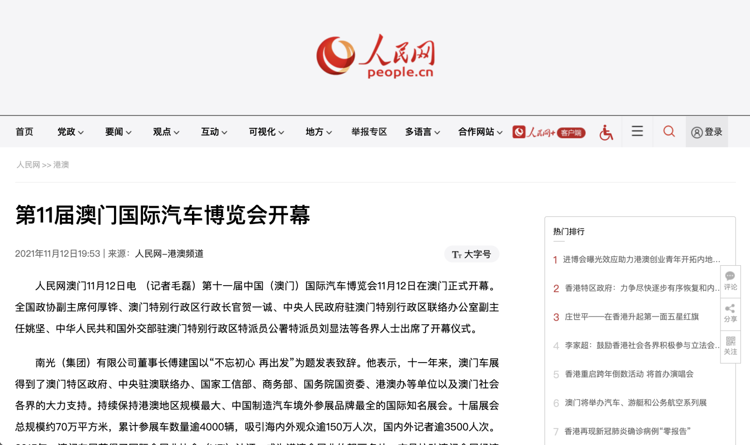 ? ? ? 11月14日,由中國機械工業(yè)集團有限公司(簡(jiǎn)稱(chēng)國機集團)、南光(集團)有限公司和澳門(mén)會(huì )議展覽業(yè)協(xié)會(huì )共同主辦,中國機械國際合作股份有限公司(簡(jiǎn)稱(chēng)中機國際)、南光國際會(huì )議展覽有限公司、澳門(mén)派意市場(chǎng)推廣服務(wù)有限公司承辦的第十一屆中國(澳門(mén))國際汽車(chē)博覽會(huì )(以下簡(jiǎn)稱(chēng)澳門(mén)車(chē)展)于澳門(mén)威尼斯人金光會(huì )展中心圓滿(mǎn)閉幕。?